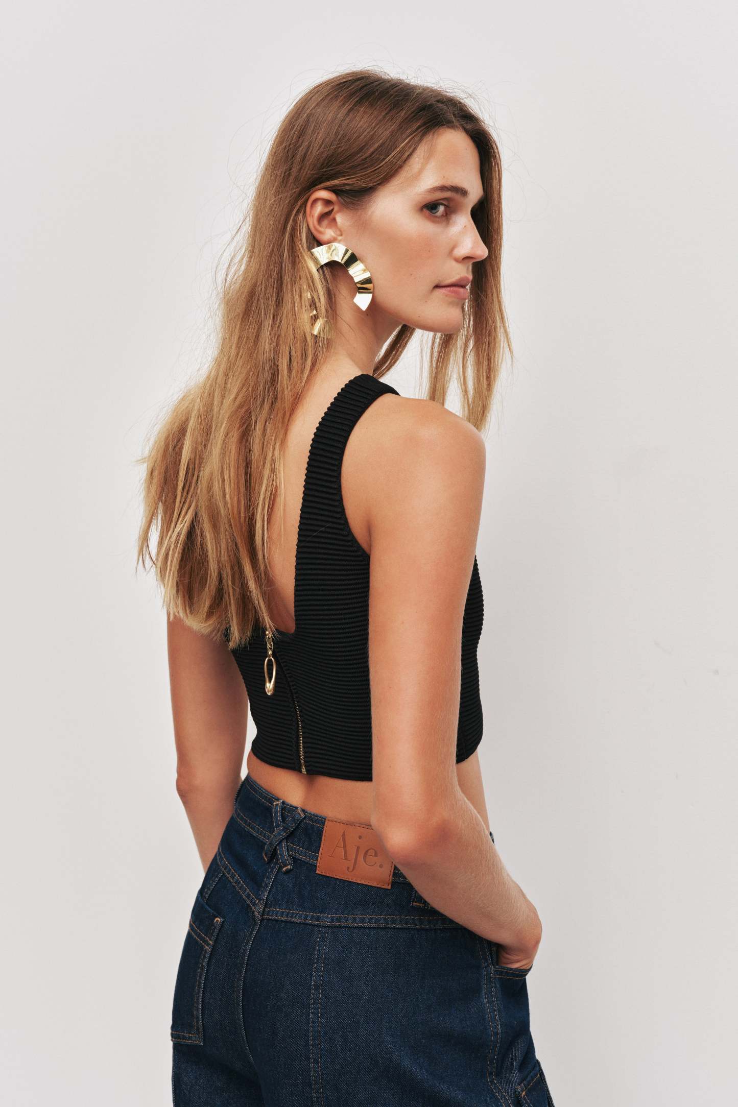 - External back zip with sculptural puller