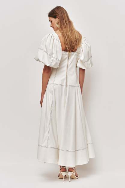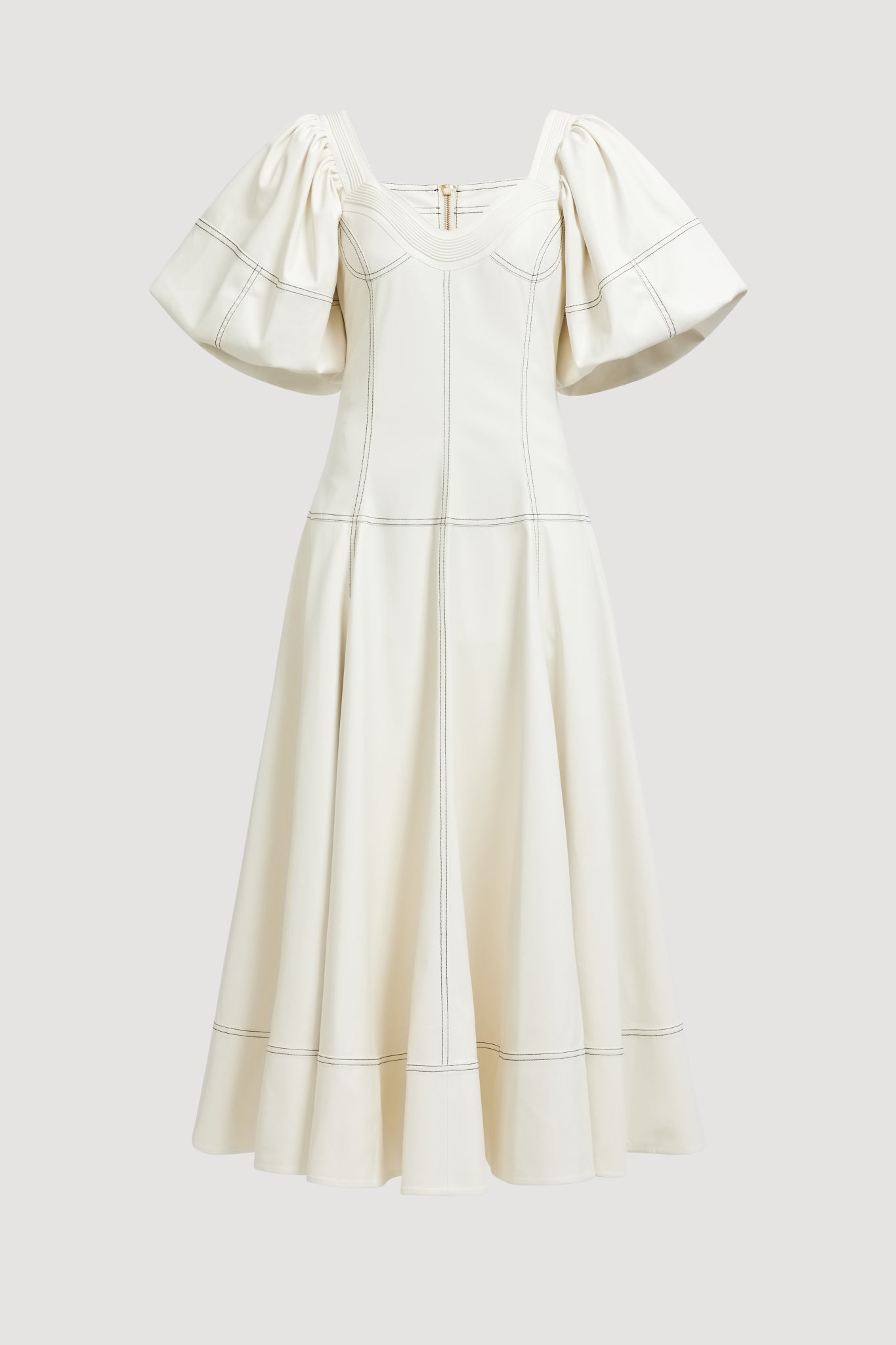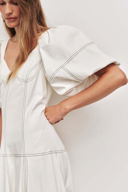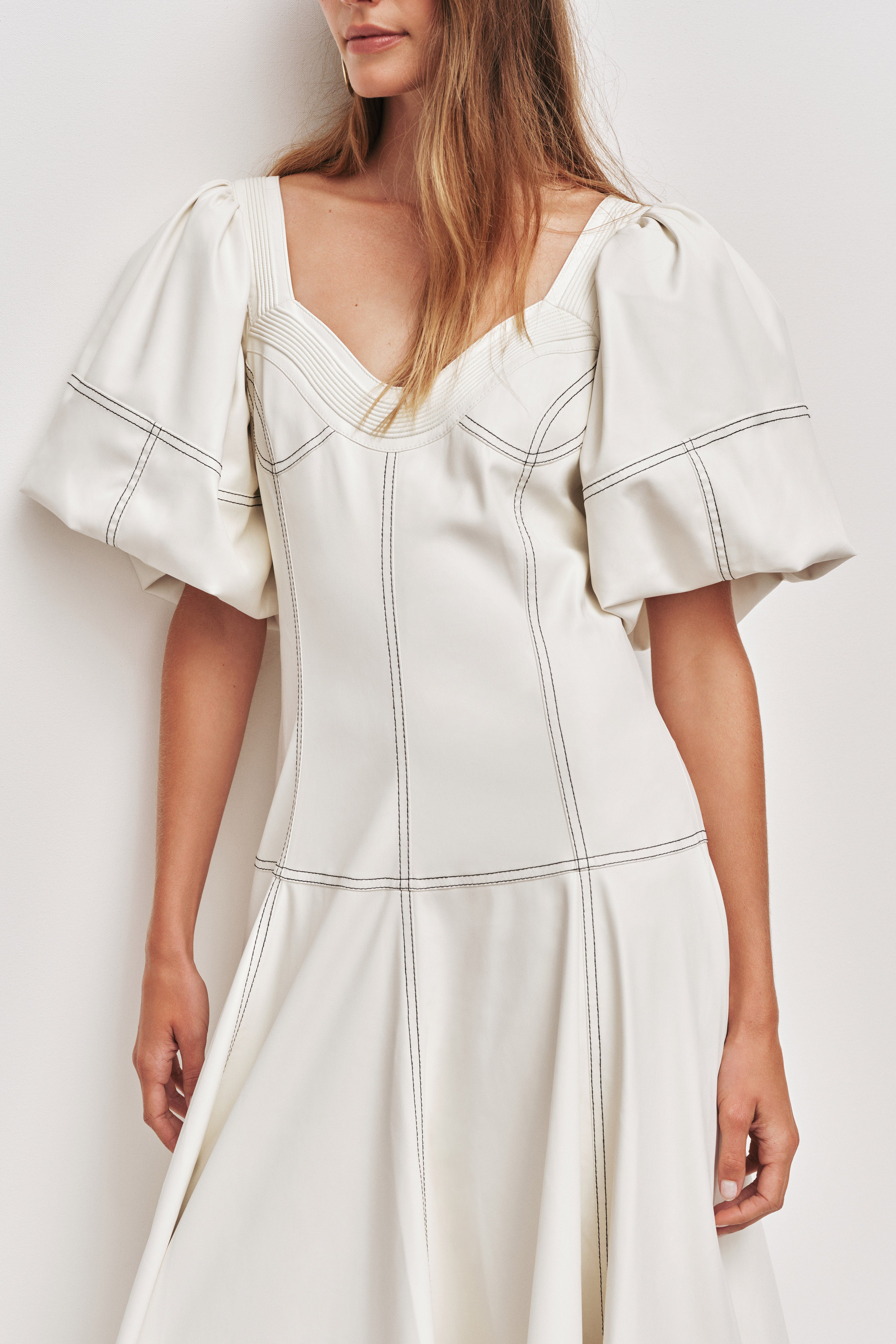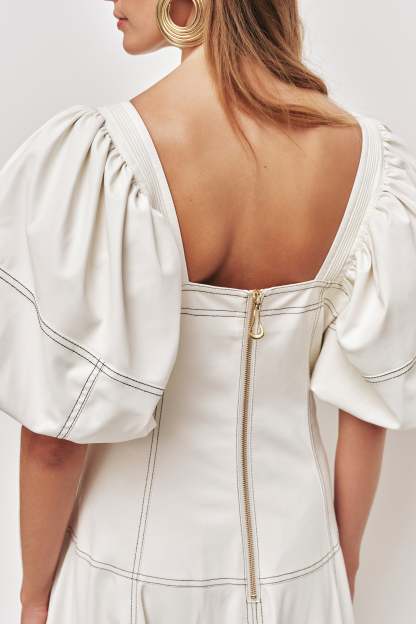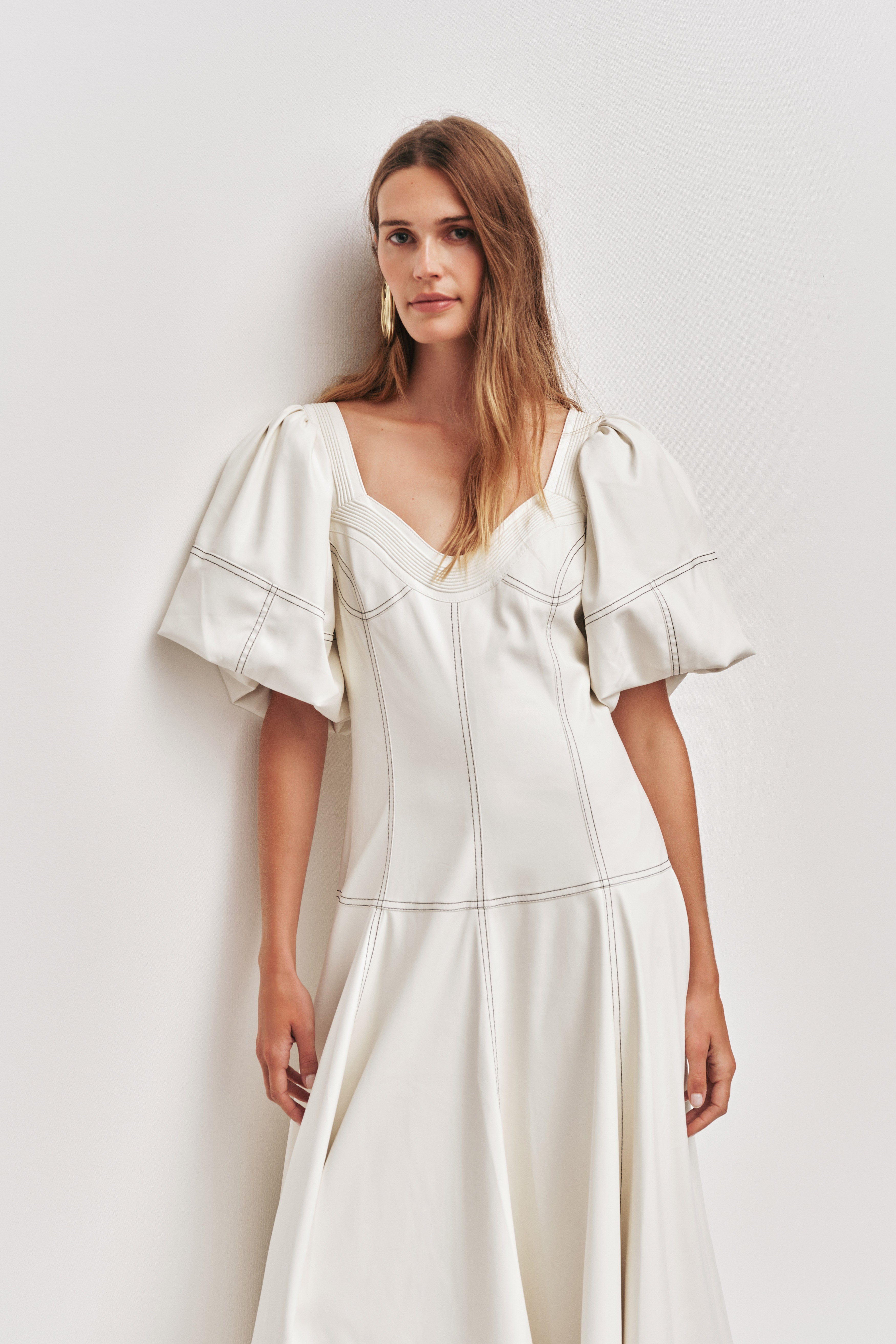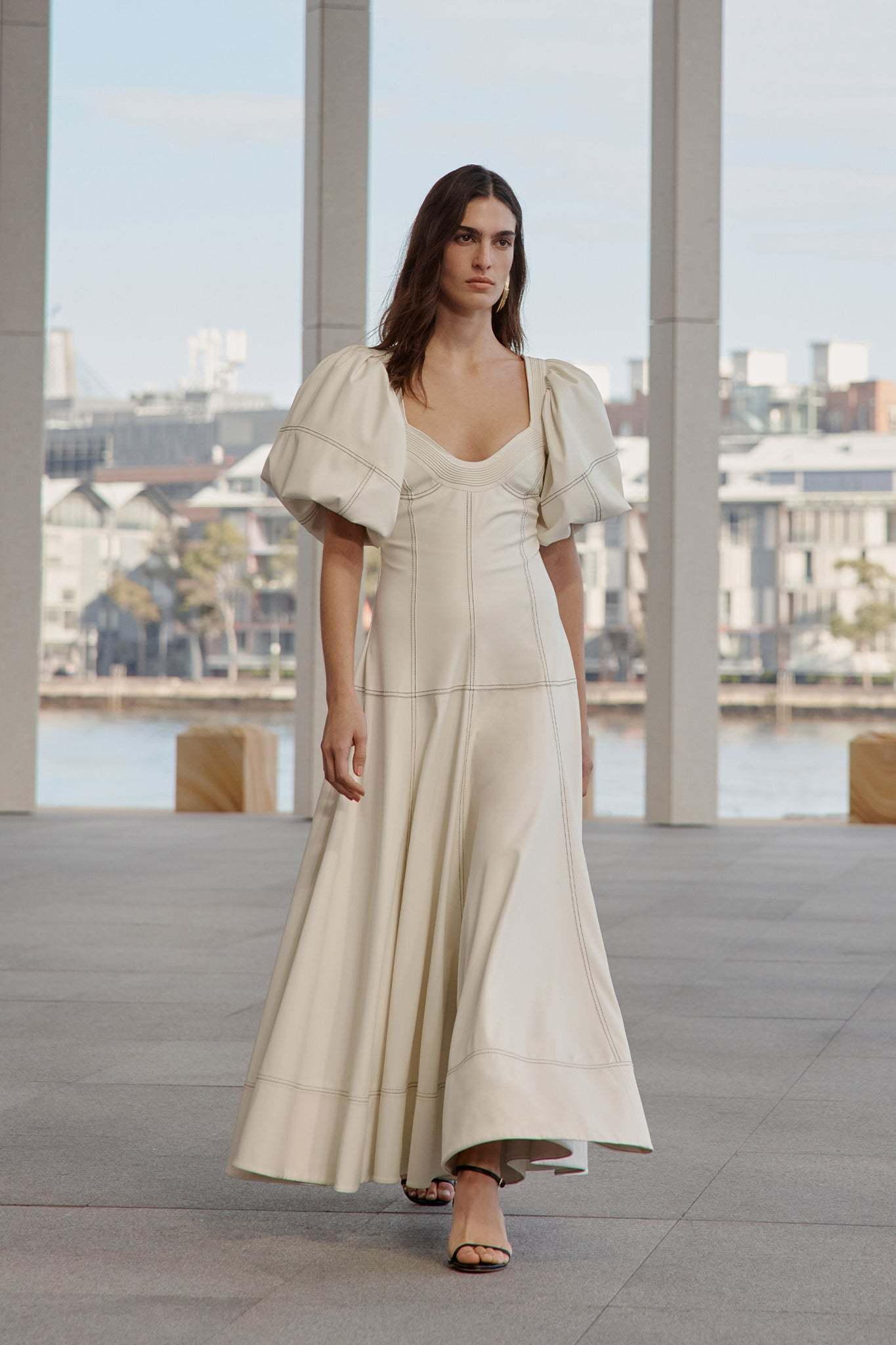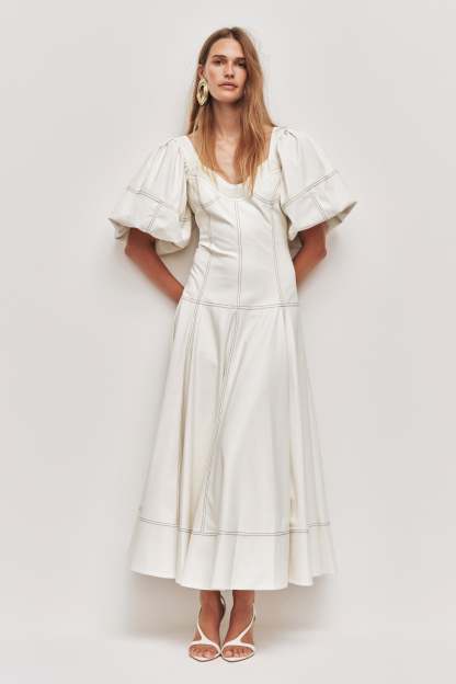 - Voluminous puff sleeves add dramatic proportion and soft structure