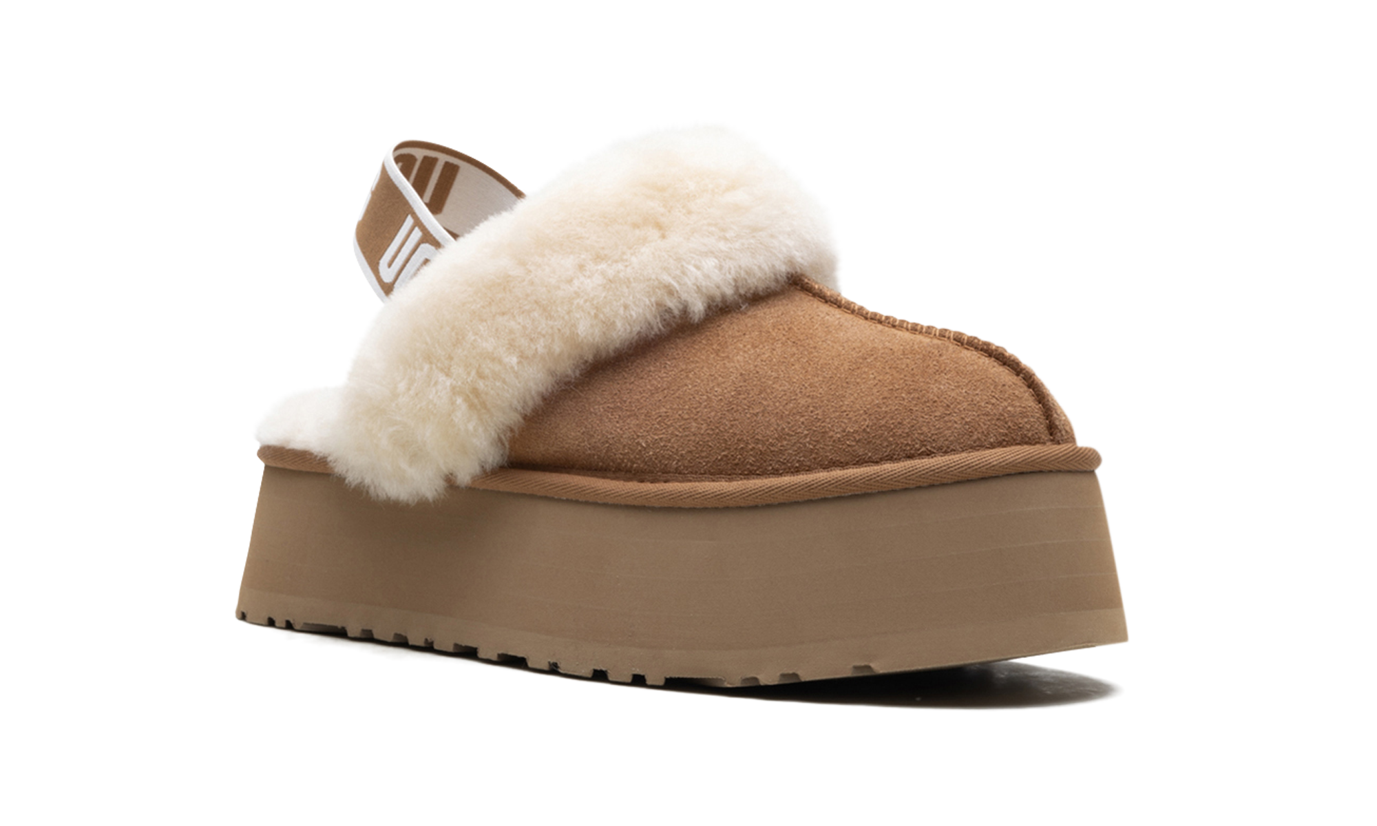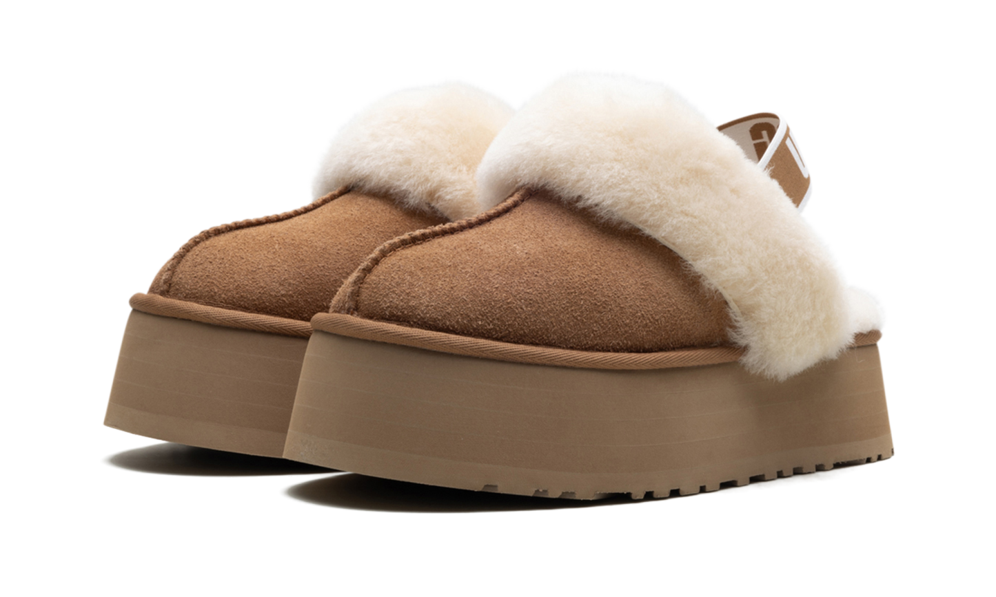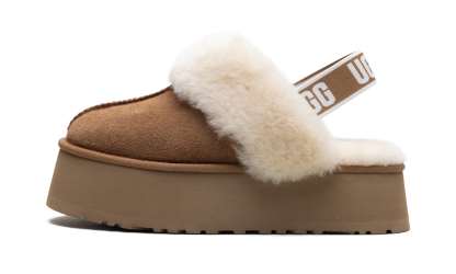 Experience elevated comfort with the stylish UGG Funkette Slipper Wmns "Chestnut," nicknamed the 'Platform Cozy!' This slipper updates the iconic silhouette with a bold, layered platform sole, instantly giving you a fashionable lift. Wrapped in rich suede and signature sheepskin lining, it guarantees cozy warmth indoors and out. The graphic UGG elastic backstrap ensures a secure, slip-on fit, while the durable Treadlite outsole offers traction. Grab this perfect blend of luxurious comfort and trendy, head-turning height!