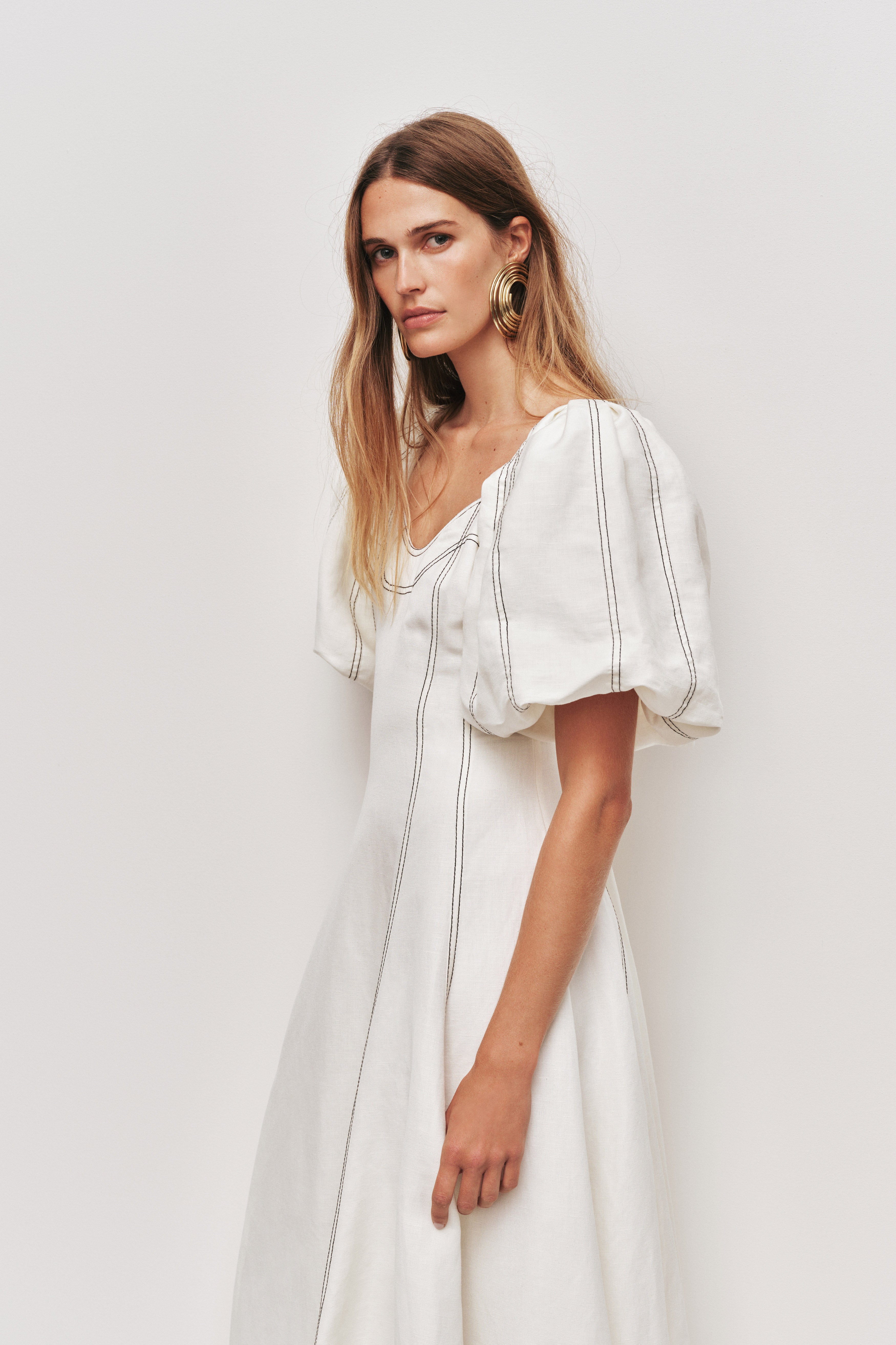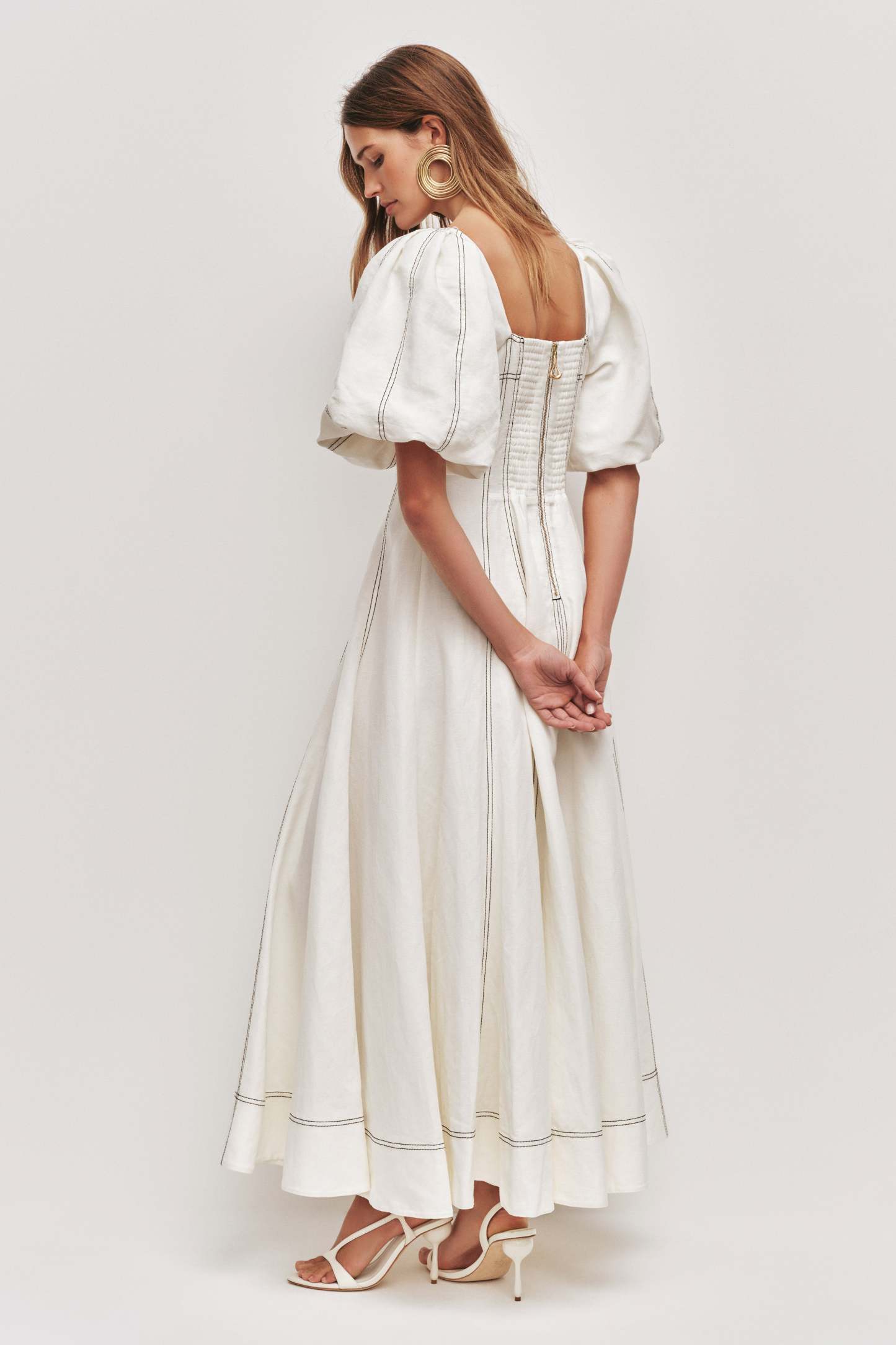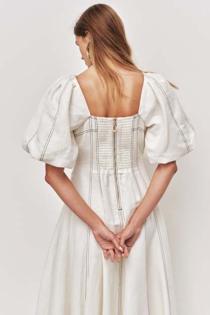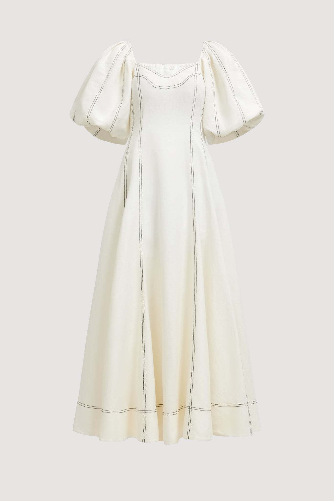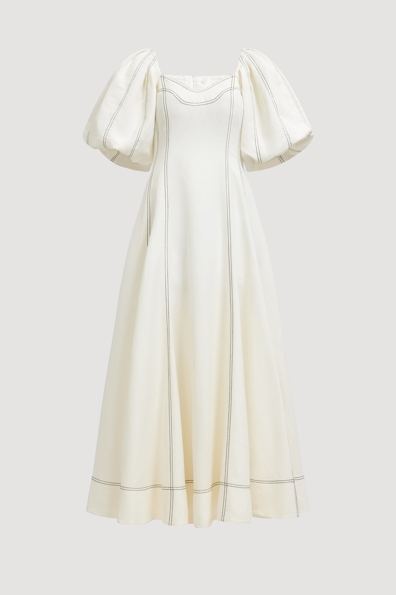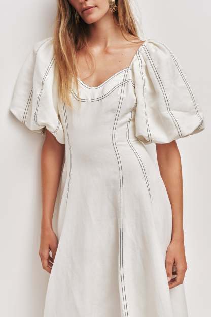 - Shaped neckline frames the décolletage, complemented by puff sleeves with tailored seaming for subtle volume.