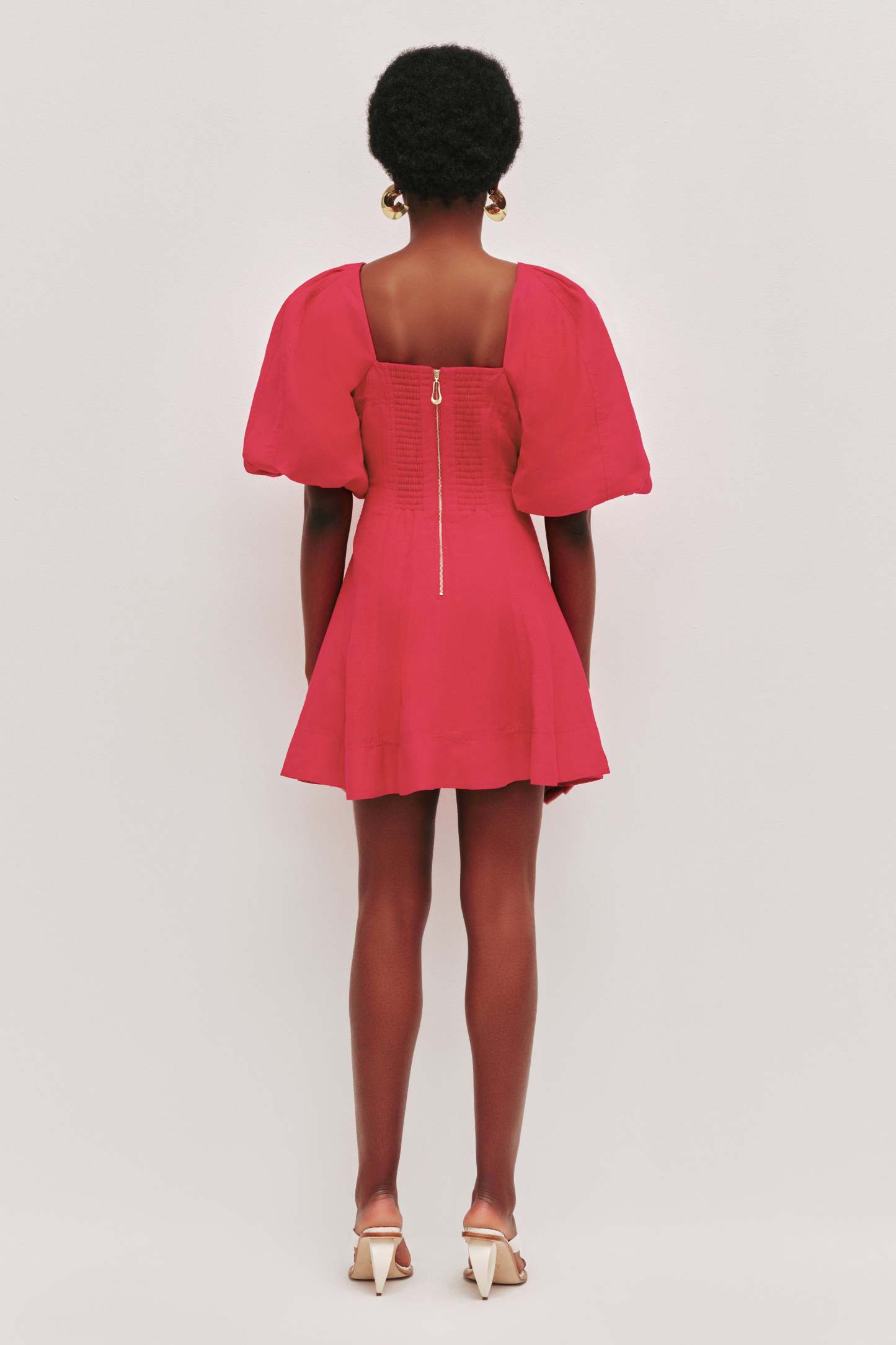 - External metal back zip with sculptural puller