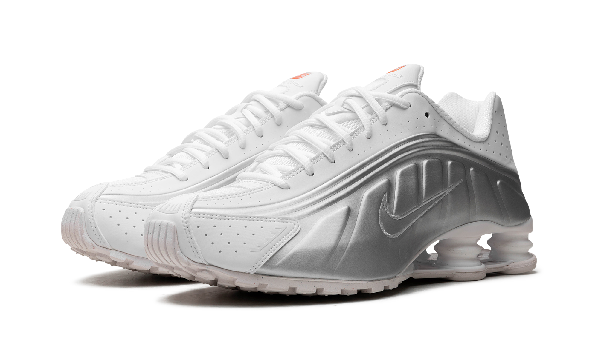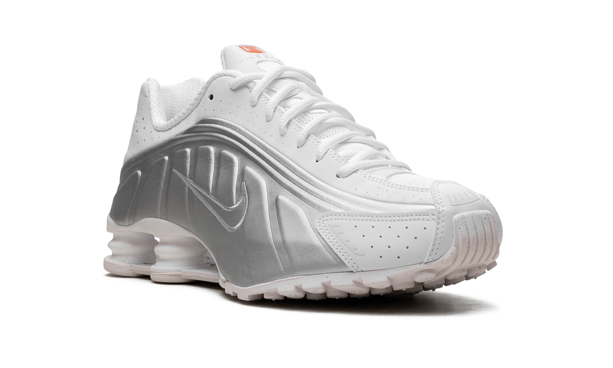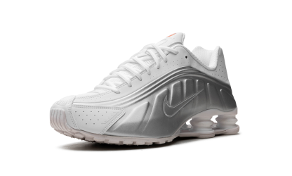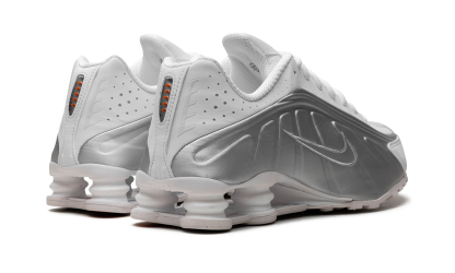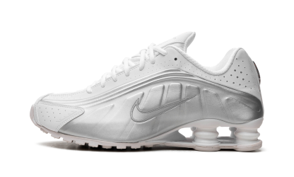 The Nike Shox R4 women's shoe is built with soft and durable synthetic and textile materials that bring forth a disruptive retro aesthetic, in a good way. The majority of the upper takes on a pristine combination of metallic silver and bright white. Perforations near the toe and around the ankle enhance breathability, and the four-pronged foam cushioning system and Pebax stability plate provide exceptional cushioning and unparalleled shock absorption. Finally, red accents the tongue, footbed, heel, and the bottom of the sole.